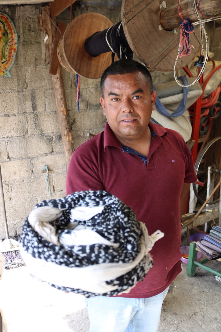 César Pérez Garcia, alongside his father Rodolfo and lifetime friend Gabino Castillo (weaving for 45 years!) created some beautiful Rebozo de bolita using a pedal loom at his at home workshop in Tenancingo, Estado de Mexico.